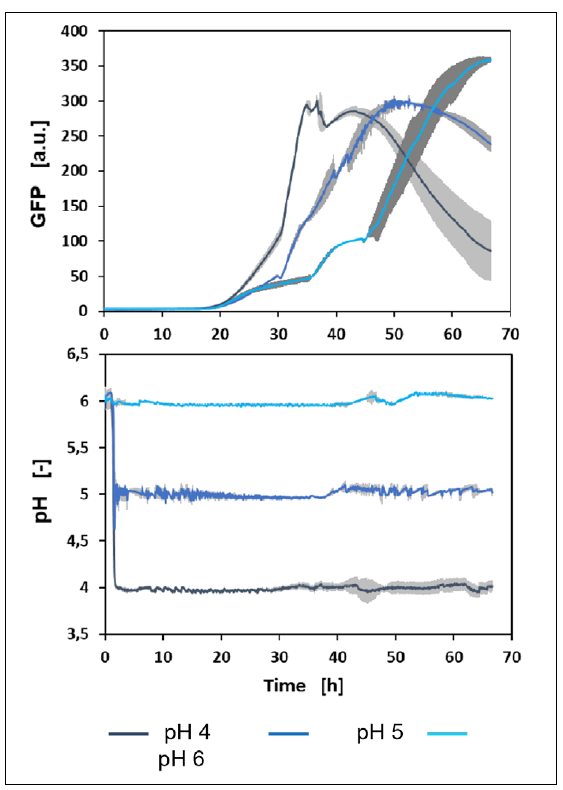 W tym przykładzie urządzenie BioLector XT zostało użyte do określenia optymalnego zakresu pH dla wydajnej produkcji białka w modelu drożdżowym Hansenula polymorpha.